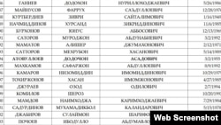 Наряду с персональными данными сотен лиц, вообще не известных публике, в этом списке числятся председатель запрещенной в Таджикистане Партии исламского возрождения Мухиддин Кабири, а также члены его семьи и родственники, как например сестра Бибисоро и брат Акоша. В список также включены Мухаммадикбол Садриддин и Саидюнус Истаравшани.